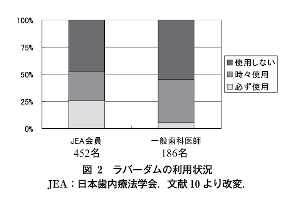 しかし、残念ながら日本の歯科医院のラバーダム装着率は低く、必ず使用している歯科医院は5.4%程度で、無菌的な配慮をして治療している歯科医院は非常に少ないのが現状です。そのことをふまえると、既に根管治療を施された歯のほとんどは質の低い根管治療であることが予想されます。また、不適物(適合の悪い)の被せ物を除去した際には虫歯が確認されることも多く、根に細菌が侵入している可能性は否定できないのです。