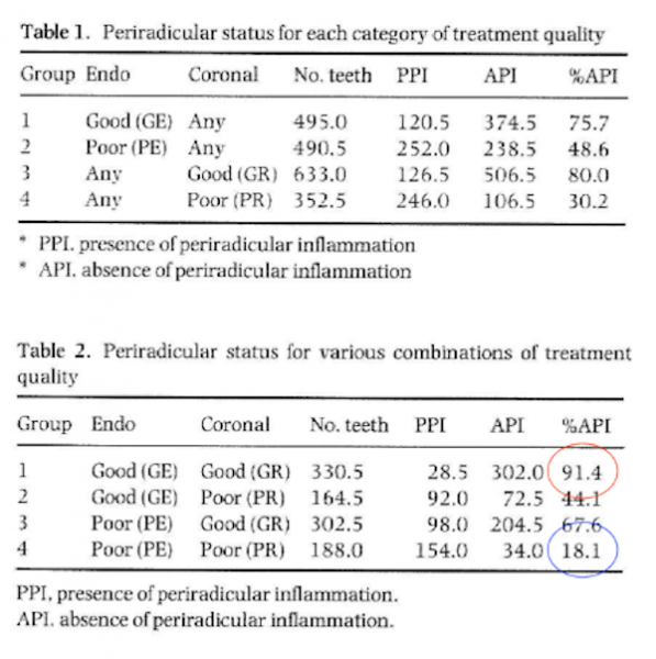 M.Tropeらの研究で、テンプル大学に来院した1010人の患者のX 線記録から根管充填と歯冠修復(被せ物)の質を評価し、根尖性歯周炎の有病率を調査した文献があります。その中で、根管治療の質と被せ物の質はどちらがどれだけの影響を与えているか判断することは難しいが、少なくとも両方の因子が影響を与えていると述べています。