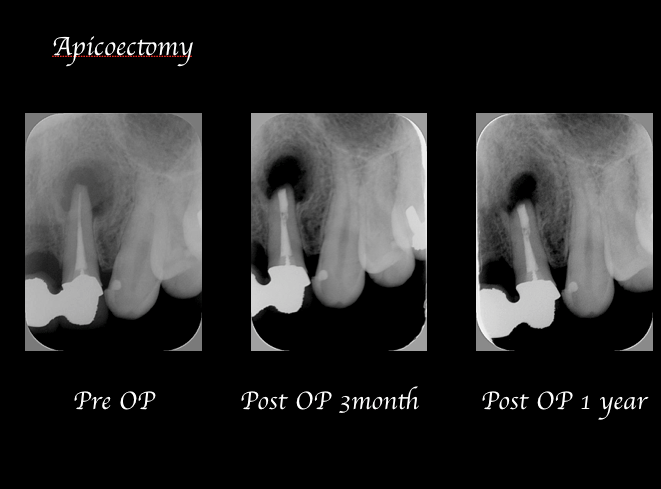 現在の顕微鏡下(歯科用マイクロスコープ)での歯根端切除術の成功率は技術を習得している者(歯科医師)であれば90%以上であるため、殆どの症例に関しては歯内療法外科(歯根端切除術)を施すことで多くの根尖性歯周炎を治癒に導くことが可能になります。