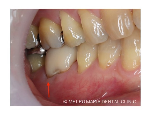 右の口腔内写真赤矢印部分には限局的な歯周ポケット10mmを確認し、歯根破折の可能性を疑わせる。